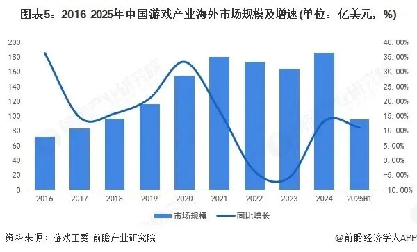 我国出海收入从“爆发式”到“高质量”。根据游戏工委数据表明,2024年我国游戏产业海外收入为185.57亿美元,海外市场规模创历史新高,同比增长13.39%。从长期趋势上看,2016-2025年间海外收入从72.29亿美元扩大至2025年185.57亿美元,年复合增长率为12%。其中,2016-2021年间增长率均超过14%,海外市场收入处于快速增长期,自2022年后增速放缓,步入高质量发展阶段。