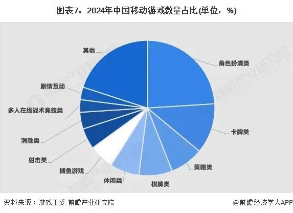 从数量上看,2024年在收入排名前100的移动游戏产品中,角色扮演类居首位,占比达24%,同比下降7%。卡牌类居次,占比12%,同比2023年上升一位。策略和棋牌类占比均为8%。需要留意的是,2023年占比第四的射击类游戏,2024年大幅降至第七位。
