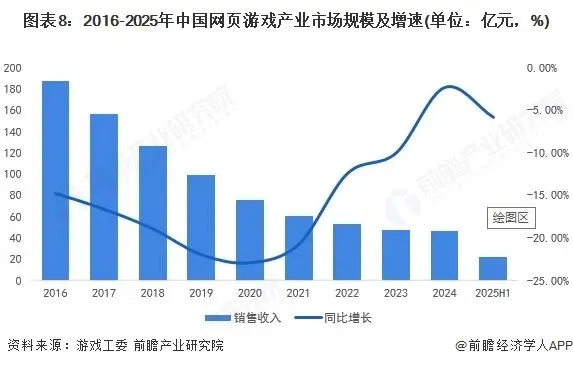 2025上半年,我国网页游戏市场实际销售收入为22.03亿元,同比下降5.87%。从总体趋势上看,2016-2025年,我国网页游戏市场实际销售收入已连续9年下滑,市场规模有所萎缩。