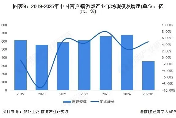 2025上半年,我国客户端游戏市场实际销售收入为354.03亿元,同比增长4.86%。从总体趋势上看,2019-2025年,我国客户端游戏市场实际销售收入由下降转为缓慢增长,市场规模总体平稳。