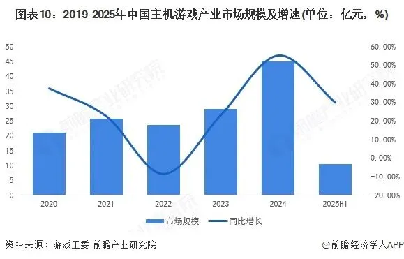 2025上半年,我国主机游戏市场实际销售收入为10.34亿元,同比增长29.78%。从总体趋势上看,除2022年外,我国主机游戏市场实际销售收入从2020年21.09亿元增至2024年44.88亿元,增速长期高于20%,总体呈现快速增长,市场规模不断扩大的发展趋势。