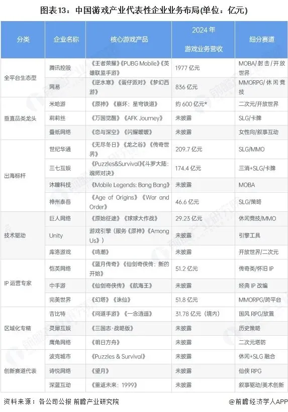 在竞争方面,目前我国游戏产业市场参与者众多,市场较分散,但全平台生态型企业占据市场龙头地位。部分企业同时布局多个赛道,如腾讯、网易等,2024年仅腾讯和网易两家企业游戏业务收入占据中国游戏上市公司市值60%。同时,市场上也有部分企业专注于单一细分市场,如米哈游、莉莉丝、叠纸等依托自身技术和行业单一产品垂类经验,发展出二次元赛道、出海赛道、乙女赛道等细分市场。
