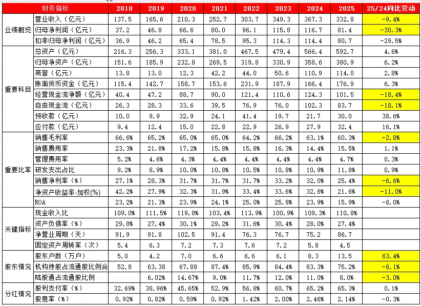 5、生意急剧变差是在2025年,相比2024年,收入降低了9.4%,而归母利润降低了30.4%,主要原因是毛利率降低严重(海外市场拓展顺利,生意占比提高,但是相对国内市场毛利率低,拉低了整体毛利率;国内医药行业集采、反腐等,毛利率降低,再加上政府采购减少,国内市场营收降低,也造成了整体利润降低)。