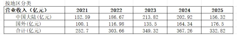 国内营收从2021年的152.59亿,涨到2023年的213.82亿(峰值),然后2024、2025年连续下滑,2025年下滑严重,又回到156.32亿,几乎和2021年持平。