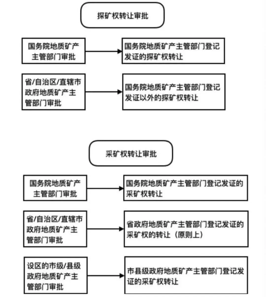 国务院地质矿产主管部门负责由其审批发证的矿业权转让的审批,省、自治区、直辖市人民政府地质矿产主管部门负责其他矿业权转让的审批。