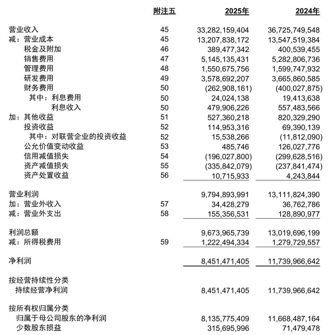 企业的基本财务报表有三张,就是资产负债表、利润表和现金流量表。迈瑞医疗发布了2025年的年报,这是迈瑞医疗的合并利润表。第一步,比较营业收入成长性