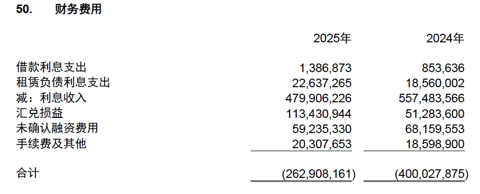 迈瑞2025年度的利息费用为0.24亿元,2024年为0.19亿,而其中的大头是租赁负债利息支出,2025年占比94.3%,2024年占比95.6%。