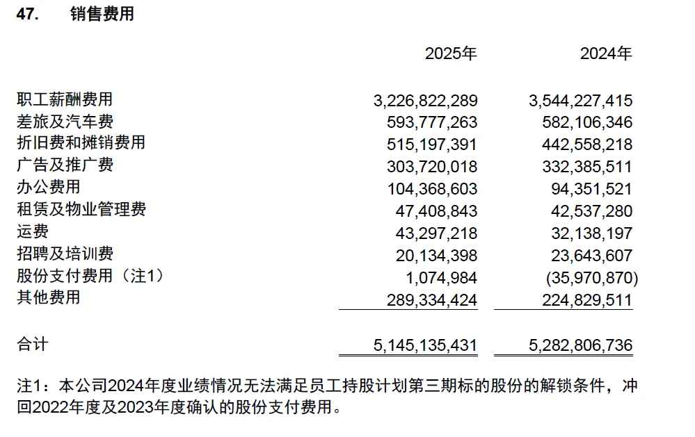 迈瑞2025年度的销售费用为51.5亿元,销售费率为15.5%。2024年度销售费用为52.8亿元,销售费率为14.4%。其中职工薪酬费用占比最高,2025年为62.7%,2024年为67.1%