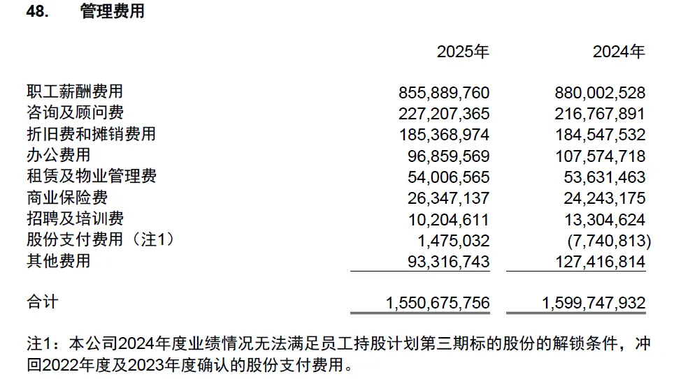 迈瑞2025年度的管理费用为15.5亿元,管理费率为4.7%。2024年度管理费用为16亿元,管理费率为4.4%。其中职工薪酬费用占比最高,2025年为55.2%,2024年为55%。