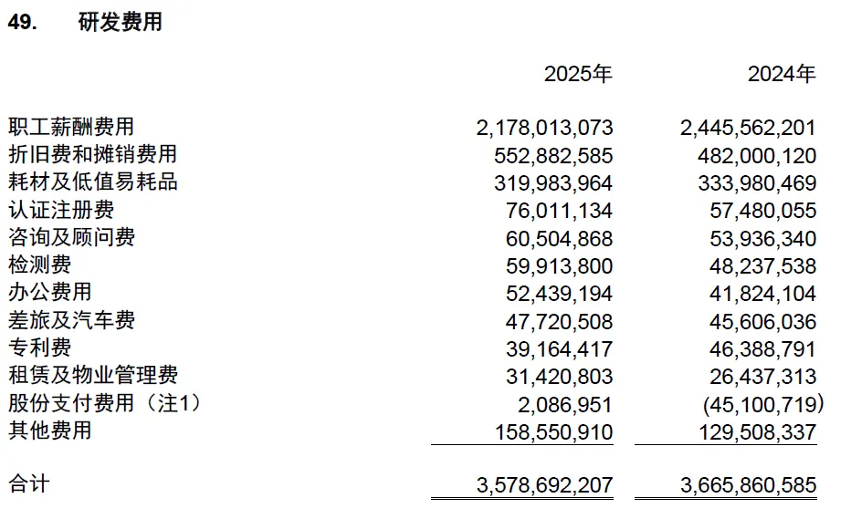 迈瑞2025年度的研发费用为35.8亿元,研发费率为10.8%。2024年度研发费用为36.7亿元,研发费率为10%。其中职工薪酬费用占比最高,2025年为60.9%,2024年为66.7%。