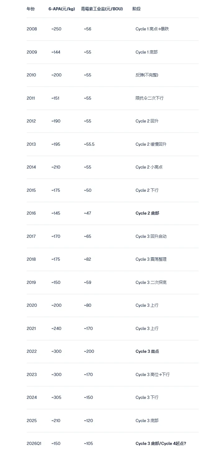 周期是放大器,成长是锚:即使 6-APA 价格波动,成长业务稳步增长下,底部年份仍盈利、高位年份弹性显著,10 年平均净利润约 24 亿支撑合理估值。当前定价隐含悲观预期:10.28 港元对应约 170 亿市值,隐含成长失速、周期低迷的极端保守假设,安全边际充足。风险提示:最大风险为成长业务不及预期,周期风险为超长低迷期,模型基于历史周期假设,实际或受政策 / 技术影响。六、5-10年长期要点与关键变量(基于已核验信息)