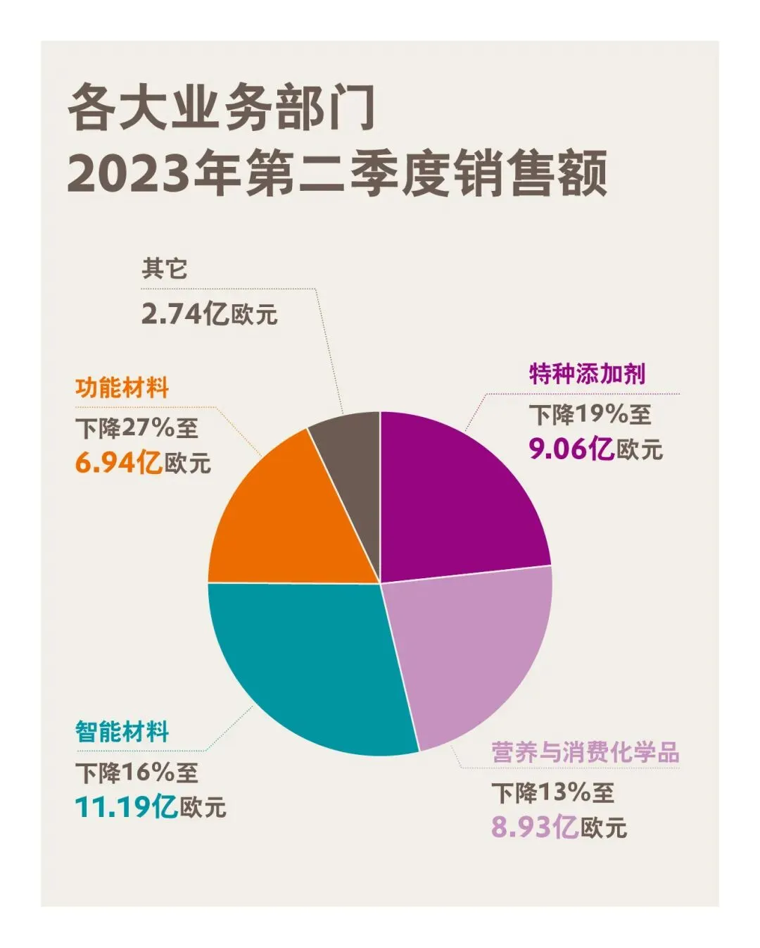由于销量下降和汇率带来的负面影响,第二季度销售额同比下降19%,为9.06亿欧元。相比之下,由于原材料和能源成本上涨,售价略有上涨。去年的数据包括了TAA衍生品业务的销售额,该业务已于2022年底出售。用于建筑和涂料行业的产品在所有地区的需求均有所下降,导致销售额大幅下降。用于聚氨酯泡沫和耐用消费品的添加剂的销售额也有所下降。用于汽车行业的添加剂销量下降,但售价略有上涨。特种添加剂业务部门调整后EBITDA下降24%,为1.99亿欧元,主要由于销量下降和产能利用率下降。调整后EBITDA利润率为22.0%,仍保持在良好水平。
