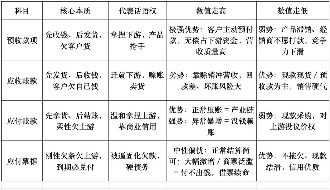 应付账款、应付票据:占上游的钱 预收款项:占下游的钱→ 两头都能占资金的企业,是顶级产业链王者;一边预收款暴跌、一边应收暴涨、一边应付暴涨,就是走下坡路。