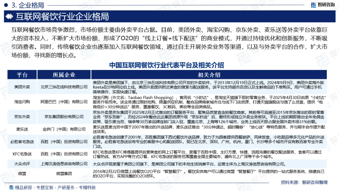 企业格局:互联网餐饮市场竞争激烈,市场份额主要由外卖平台占据。目前,美团外卖、淘宝闪购、京东外卖、麦乐送等外卖平台依靠巨大的资本投入,不断扩大市场份额,形成了O2O的“线上订餐+线下配送”的商业模式,并通过持续优化和创新服务,不断吸引消费者。同时,传统餐饮企业也逐渐加入互联网餐饮领域,通过自主开展外卖业务等渠道,以及与外卖平台的合作,扩大市场份额,寻找新的增长点。