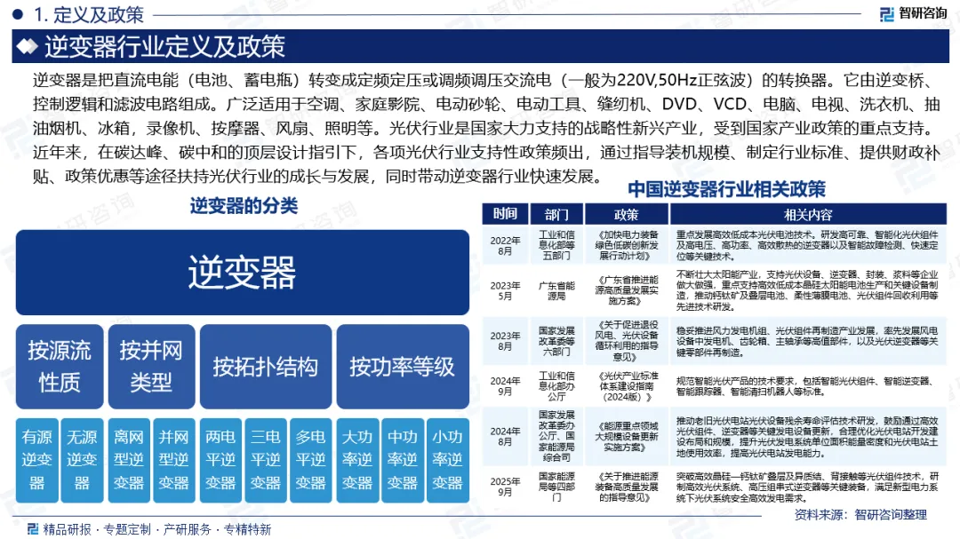 行业相关政策:光伏行业是国家大力支持的战略性新兴产业,受到国家产业政策的重点支持。近年来,在碳达峰、碳中和的顶层设计指引下,各项光伏行业支持性政策频出,通过指导装机规模、制定行业标准、提供财政补贴、政策优惠等途径扶持光伏行业的成长与发展,同时带动逆变器行业快速发展。例如,2024年8月,国家发展改革委办公厅、国家能源局综合司印发《能源重点领域大规模设备更新实施方案》,推动老旧光伏电站光伏设备残余寿命评估技术研发,鼓励通过高效光伏组件、逆变器等关键发电设备更新,合理优化光伏电站开发建设布局和规模,提升光伏发电系统单位面积能量密度和光伏电站土地使用效率,提高光伏电站发电能力。2025年9月,国家能源局等四部门印发《关于推进能源装备高质量发展的指导意见》,突破高效晶硅—钙钛矿叠层及异质结、背接触等光伏组件技术,研制高效光伏系统、高压组串式逆变器等关键装备,满足新型电力系统下光伏系统安全高效发电需求。