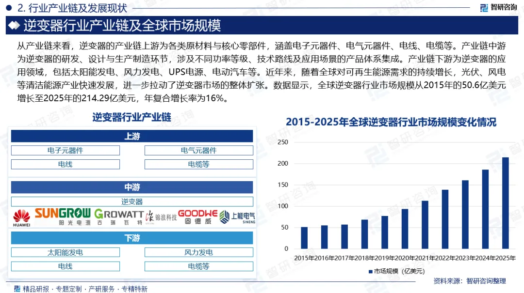 全球市场规模:逆变器在可再生能源发电系统、电力输配系统以及工业与家庭电子设备中扮演着关键角色,其在实现电力转换的同时,还具备功率调节、电压稳定等功能,有效保障电能的高效传输与可靠使用。近年来,随着全球对可再生能源需求的持续增长,光伏、风电等清洁能源产业快速发展,进一步拉动了逆变器市场的整体扩张。数据显示,全球逆变器行业市场规模从2015年的50.6亿美元增长至2025年的214.29亿美元,年复合增长率为16%。未来,随着能源结构转型深入推进、储能系统规模化应用以及智能电网建设加速,全球逆变器市场有望保持稳健增长,并在技术升级与应用拓展中迎来更广阔的发展前景。