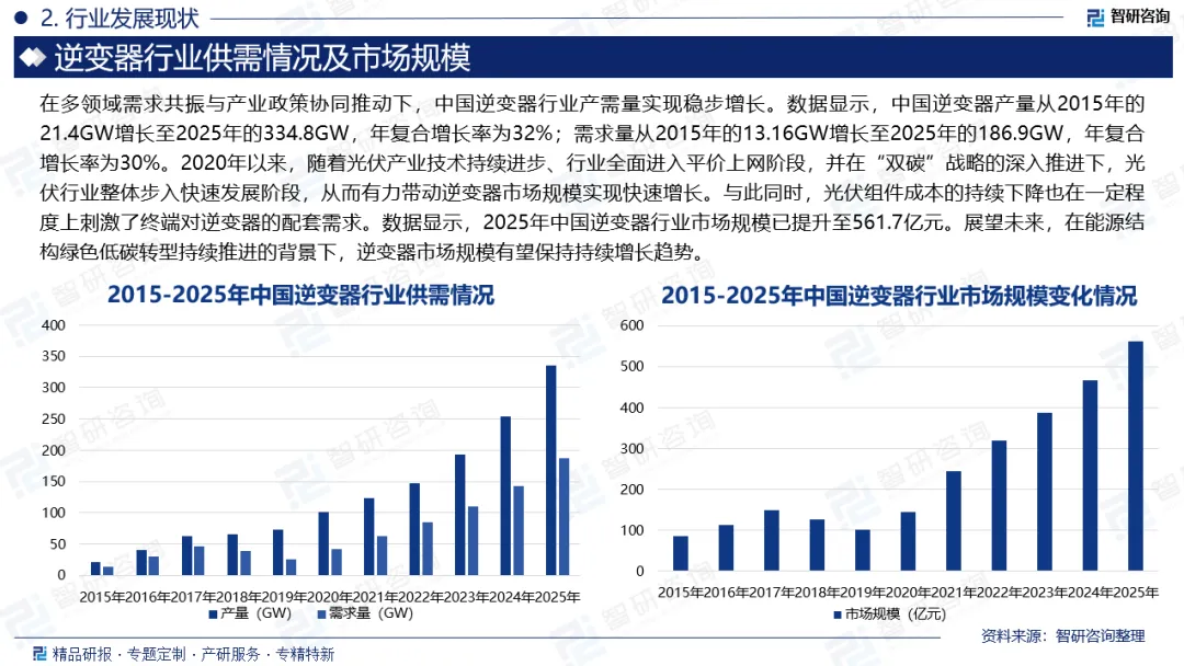 逆变器是把直流电能(电池、蓄电瓶)转变成定频定压或调频调压交流电(一般为220V,50Hz正弦波)的转换器。它由逆变桥、控制逻辑和滤波电路组成。广泛适用于空调、家庭影院、电动砂轮、电动工具、缝纫机、DVD、VCD、电脑、电视、洗衣机、抽油烟机、冰箱,录像机、按摩器、风扇、照明等。逆变器分类方式较多,按照源流性质可分为有源逆变器和无源逆变器;按并网类型可分为离网型逆变器和并网型逆变器;按拓扑结构可分为两电平逆变器、三电平逆变器和多电平逆变器;按功率等级可分为大功率逆变器、中功率逆变器和小功率逆变器。中国是全球最大的光伏市场之一,不断涌现的大规模光伏发电项目带动了对逆变器作为系统核心部件的强劲需求。国内较为完整的光伏产业链与政府对可再生能源的有力支持,共同推动中国逆变器企业在全球主要市场中份额持续提升。同时,电力体制改革鼓励分布式能源并网与智能电网建设,进一步强化了逆变器在电力转换与系统调控中的关键作用,从而拉动其需求增长。此外,新能源汽车普及与工业自动化发展也拓宽了逆变器的应用场景,为行业供需平衡与持续发展提供了多元支撑。因此,在多领域需求共振与产业政策协同推动下,中国逆变器行业产需量实现稳步增长。数据显示,中国逆变器产量从2015年的21.4GW增长至2025年的334.8GW,年复合增长率为32%;需求量从2015年的13.16GW增长至2025年的186.9GW,年复合增长率为30%。在2018至2019年间,受逆变器产品价格大幅下降及太阳能光伏新增装机增速放缓的双重影响,中国逆变器市场规模呈现阶段性收缩态势,其中2019年市场规模降至100.69亿元,同比下降20.47%。2020年以来,随着光伏产业技术持续进步、行业全面进入平价上网阶段,并在“双碳”战略的深入推进下,光伏行业整体步入快速发展阶段,从而有力带动逆变器市场规模实现快速增长。与此同时,光伏组件成本的持续下降也在一定程度上刺激了终端对逆变器的配套需求。数据显示,2025年中国逆变器行业市场规模已提升至561.7亿元。展望未来,在能源结构绿色低碳转型持续推进的背景下,逆变器市场规模有望保持持续增长趋势。中国逆变器行业已形成国内外企业多层级竞争的格局。国际领先企业如SMA、Power Electronics、SolarEdge、TMEIC、Fimer等在技术积累、品牌影响力和全球化布局方面占据优势,尤其在大型电站及高端工商业领域保持较强竞争力。国内企业以华为、阳光电源为龙头,凭借技术创新、成本优势及快速响应能力,在全球逆变器市场中份额持续提升;古瑞瓦特、锦浪科技、固德威、上能电气等企业则聚焦户用及分布式市场,通过差异化产品与渠道深耕不断强化市场地位。当前,逆变器行业呈现国内企业整体崛起、市场竞争日趋激烈、技术迭代与全球化拓展并进的发展态势。