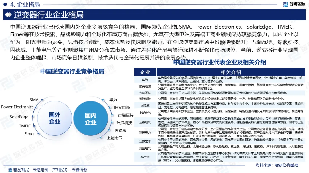 企业格局:中国逆变器行业已形成国内外企业多层级竞争的格局。国际领先企业如SMA、Power Electronics、SolarEdge、TMEIC、Fimer等在技术积累、品牌影响力和全球化布局方面占据优势,尤其在大型电站及高端工商业领域保持较强竞争力。国内企业以华为、阳光电源为龙头,凭借技术创新、成本优势及快速响应能力,在全球逆变器市场中份额持续提升;古瑞瓦特、锦浪科技、固德威、上能电气等企业则聚焦户用及分布式市场,通过差异化产品与渠道深耕不断强化市场地位。当前,逆变器行业呈现国内企业整体崛起、市场竞争日趋激烈、技术迭代与全球化拓展并进的发展态势。