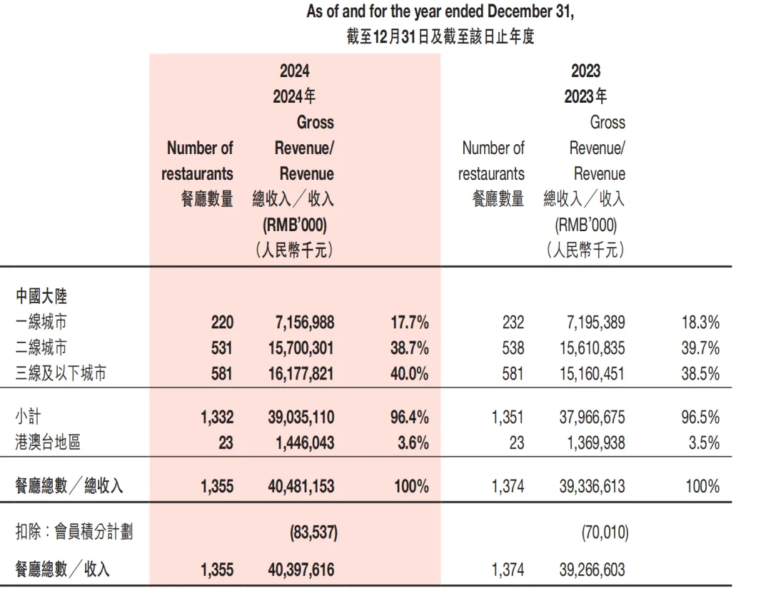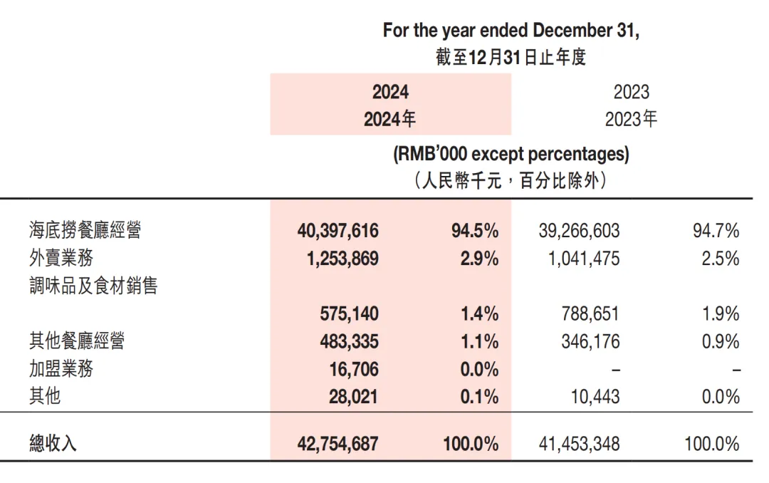 2024年,海底捞餐厅经营收入为403.98亿元,占总收入的94.5%,同比增长2.9%,仍是绝对支柱。