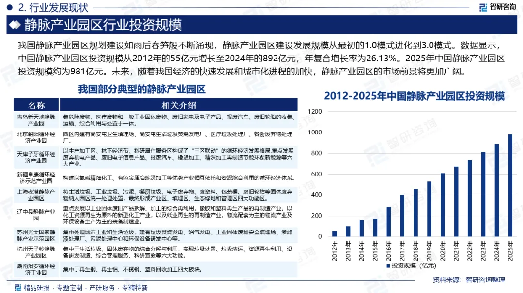 市场规模:随着我国经济社会的快速发展,工业化进程不断加快,城市化水平持续提高,对环境保护和资源循环利用的要求越来越高,静脉产业园区作为资源循环利用和生态保护的重要载体,应运而生。静脉产业园区是专注于资源回收、废物处理和再利用的综合性园区,它们在循环经济和可持续发展战略中扮演着核心角色。静脉产业园区集成了废弃物分类、处理、资源化利用的全过程,包括但不限于垃圾焚烧发电、废塑料回收、废金属熔炼、有机废物堆肥化等。近年来,随着环保法规的日益严格和公众环保意识的提升,静脉产业园区得到了快速发展,成为城市和区域循环经济的重要实践基地。数据显示,中国静脉产业园区投资规模从2012年的55亿元增长至2024年的892亿元,年复合增长率为26.13%。2025年中国静脉产业园区投资规模约为981亿元。未来,随着我国经济的快速发展和城市化进程的加快,静脉产业园区的市场前景将更加广阔。