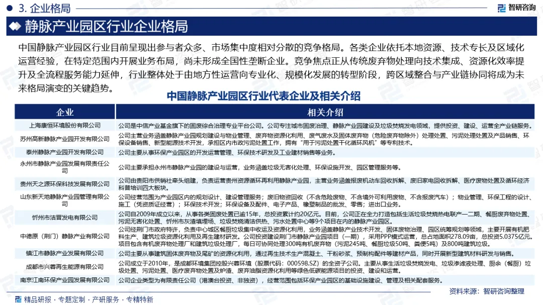 企业格局:中国静脉产业园区行业目前呈现出参与者众多、市场集中度相对分散的竞争格局。各类企业依托本地资源、技术专长及区域化运营经验,在特定范围内开展业务布局,尚未形成全国性垄断企业。竞争焦点正从传统废弃物处理向技术集成、资源化效率提升及全流程服务能力延伸,行业整体处于由地方性运营向专业化、规模化发展的转型阶段,跨区域整合与产业链协同将成为未来格局演变的关键趋势。当前,中国静脉产业园区行业代表企业包括上海康恒环境股份有限公司、苏州高新静脉产业园开发有限公司、泰州静脉产业园开发有限公司、永州市静脉产业园发展有限责任公司、贵州天之源环保科技发展有限公司、山东新天地静脉产业园管理有限公司、忻州市洁晋发电有限公司、中德原(荆门)静脉产业有限公司、镇江市静脉产业发展有限公司、成都市兴蓉再生能源有限公司、南京江南环保产业园发展有限公司等。