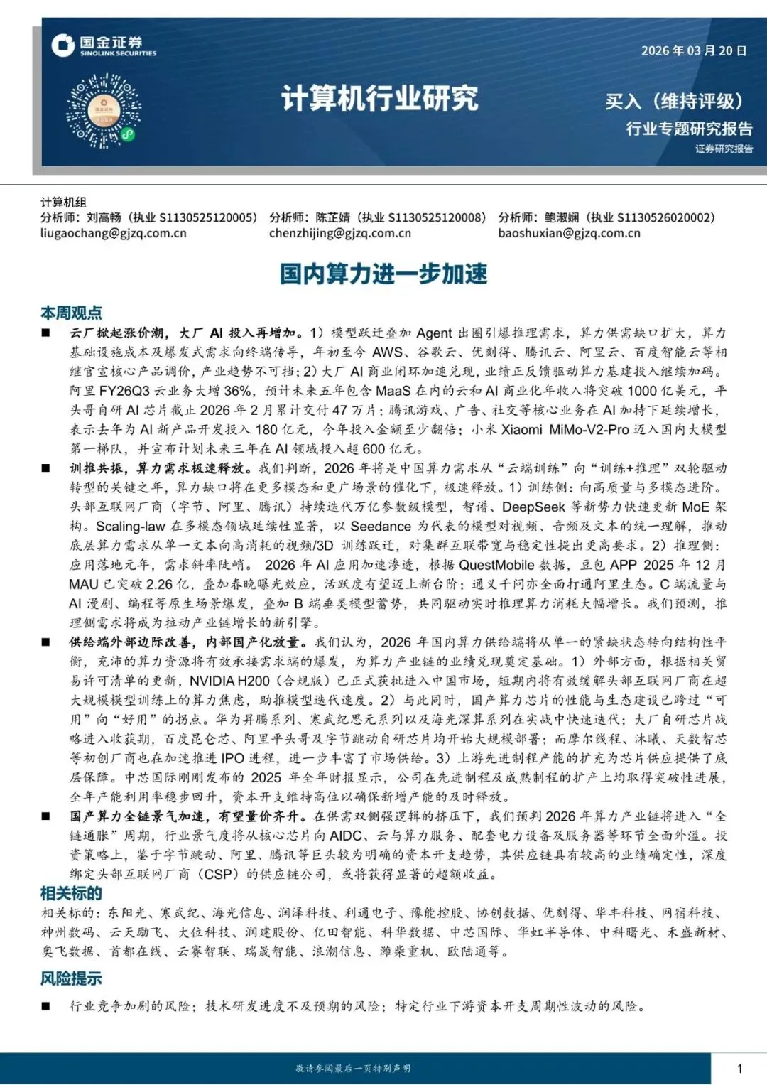 计算机行业专题研究报告:国内算力进一步加速-260320-国金证券-15页