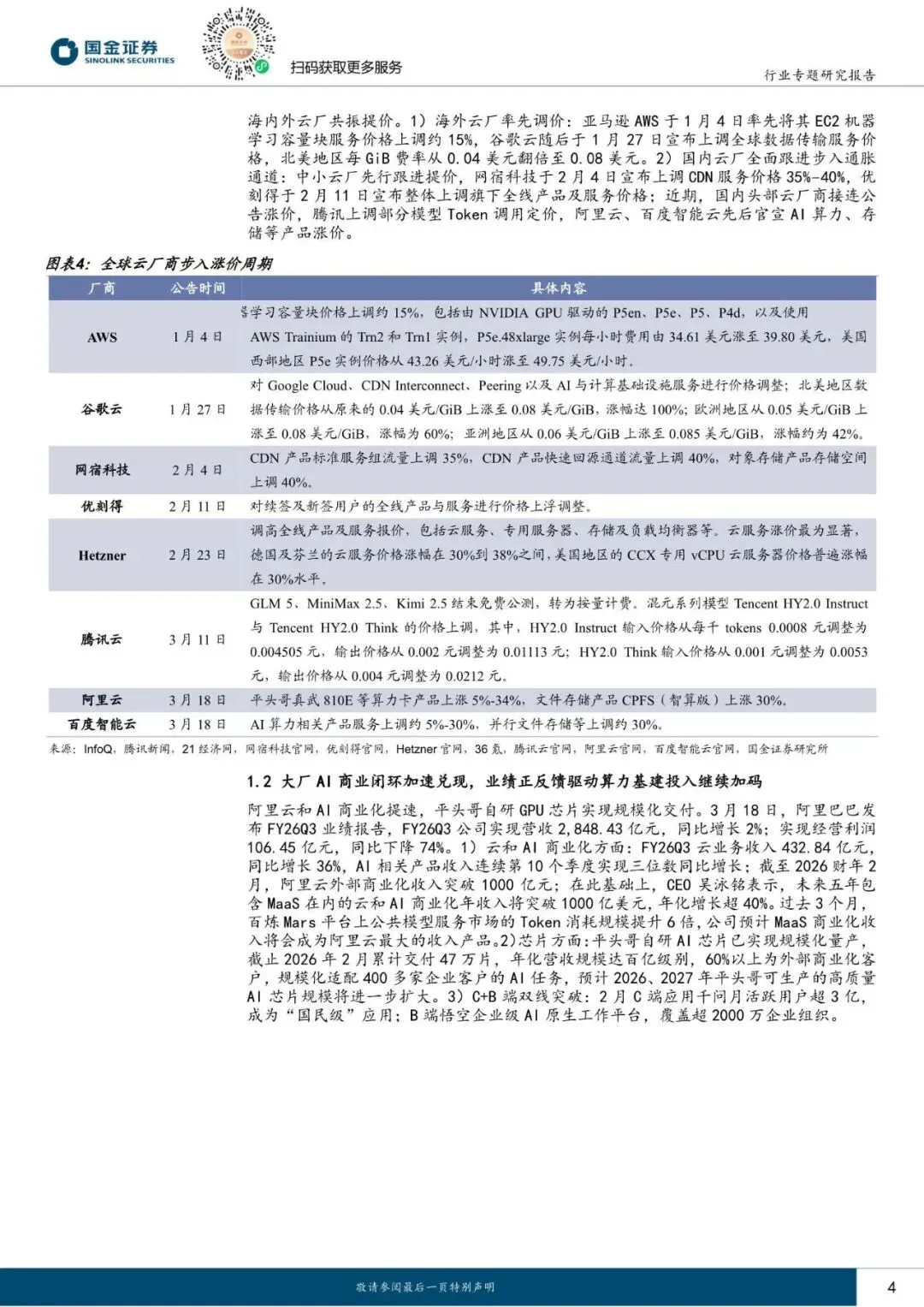 1)模型跃迁叠加 Agent 出圈引爆推理需求,算力供需缺口扩大,算力基础设施成本及爆发式需求向终端传导,年初至今 AWS、谷歌云、优刻得、腾讯云、阿里云、百度智能云等相继官宣核心产品调价,产业趋势不可挡;