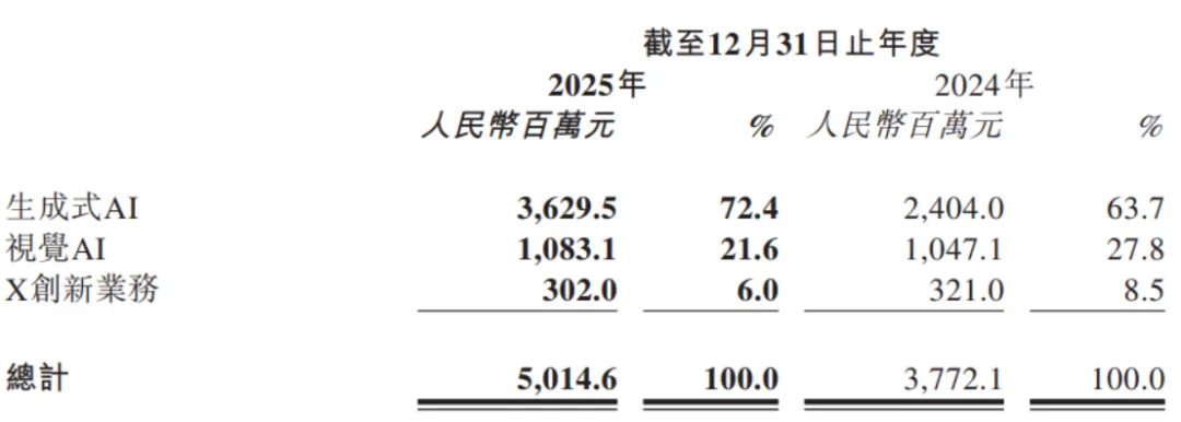 核心财务数据方面,集团总收入超过50亿元,同比增长33%,增速领跑国内AI行业。其中生成式AI收入超36亿元,同比增长51%,占总收入比重超过70%,业务结构加速向高附加值板块倾斜。