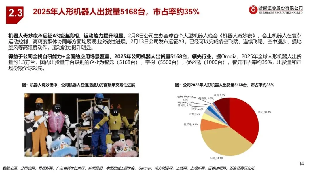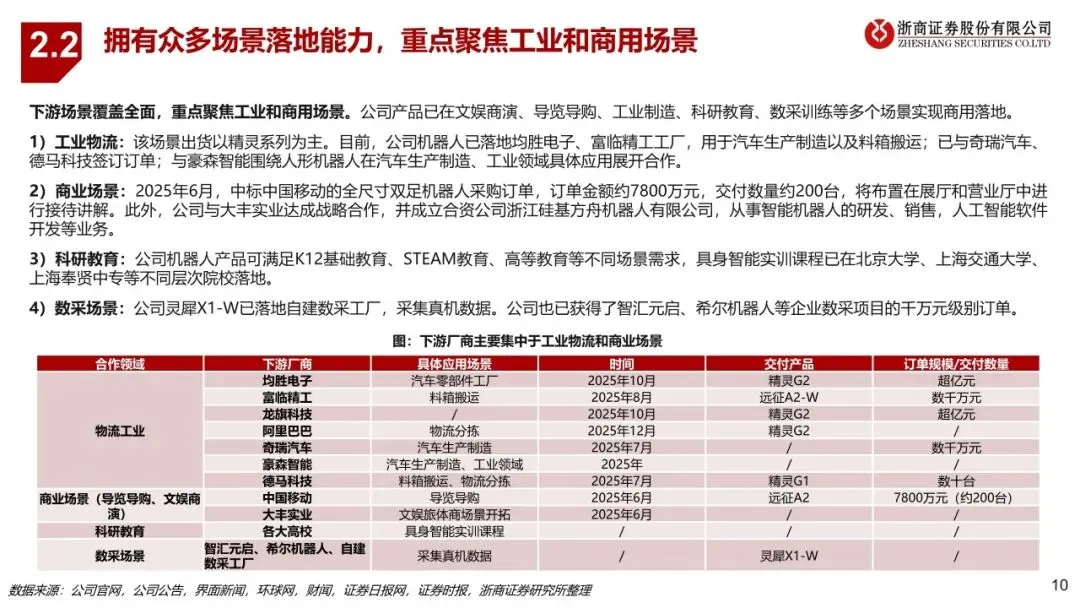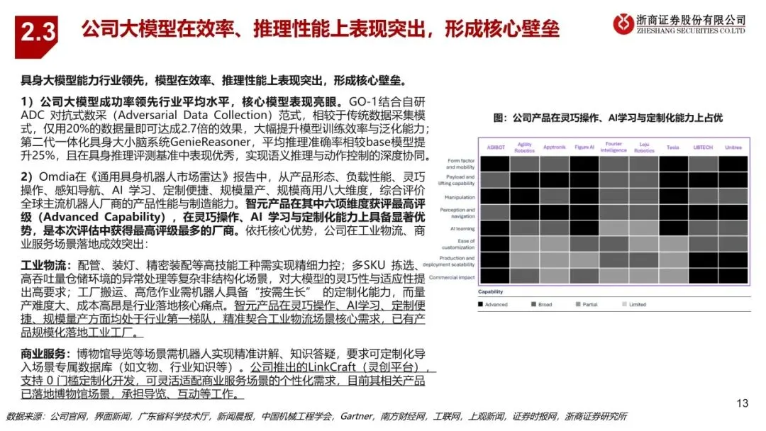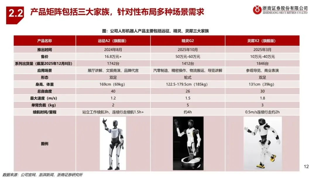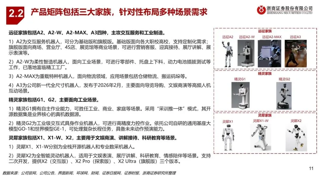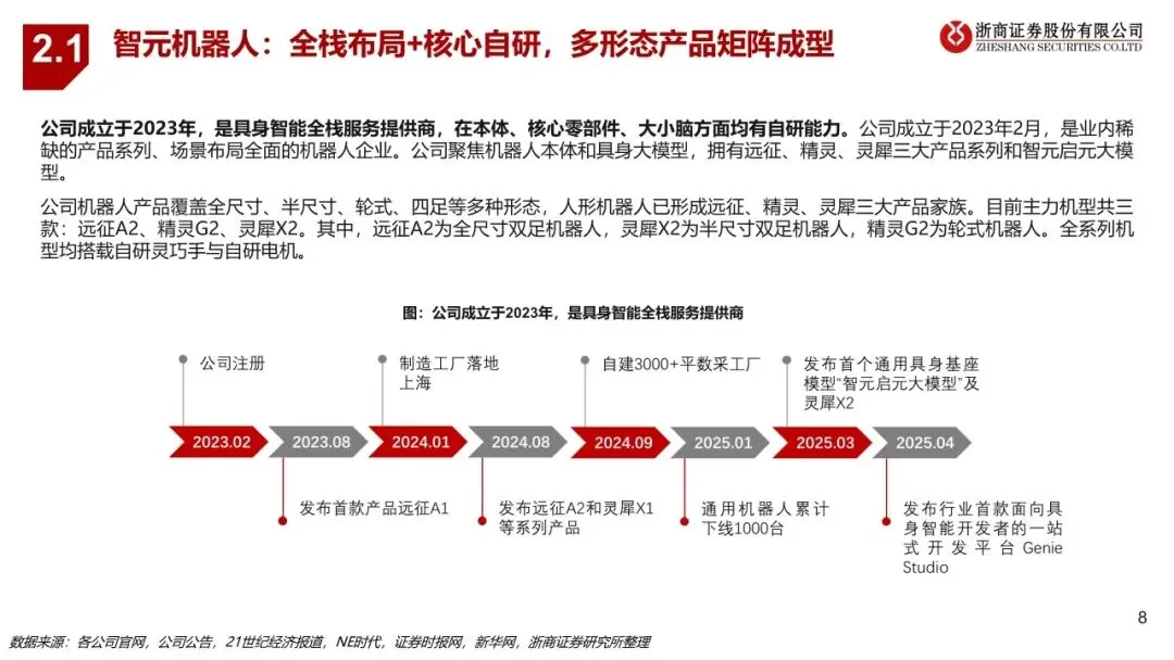 智元作为业内稀缺实现全产品系列、全场景布局的人形机器人企业,在整机、核心零部件、大小脑方面的自研能力构筑高壁垒。公司产品覆盖全尺寸、半尺寸、轮式、四足机器人等多形态,包括远征、精灵、灵犀三大家族,已应用于文娱商演、导览导购、工业制造、科研教育、数采训练等多个场景。