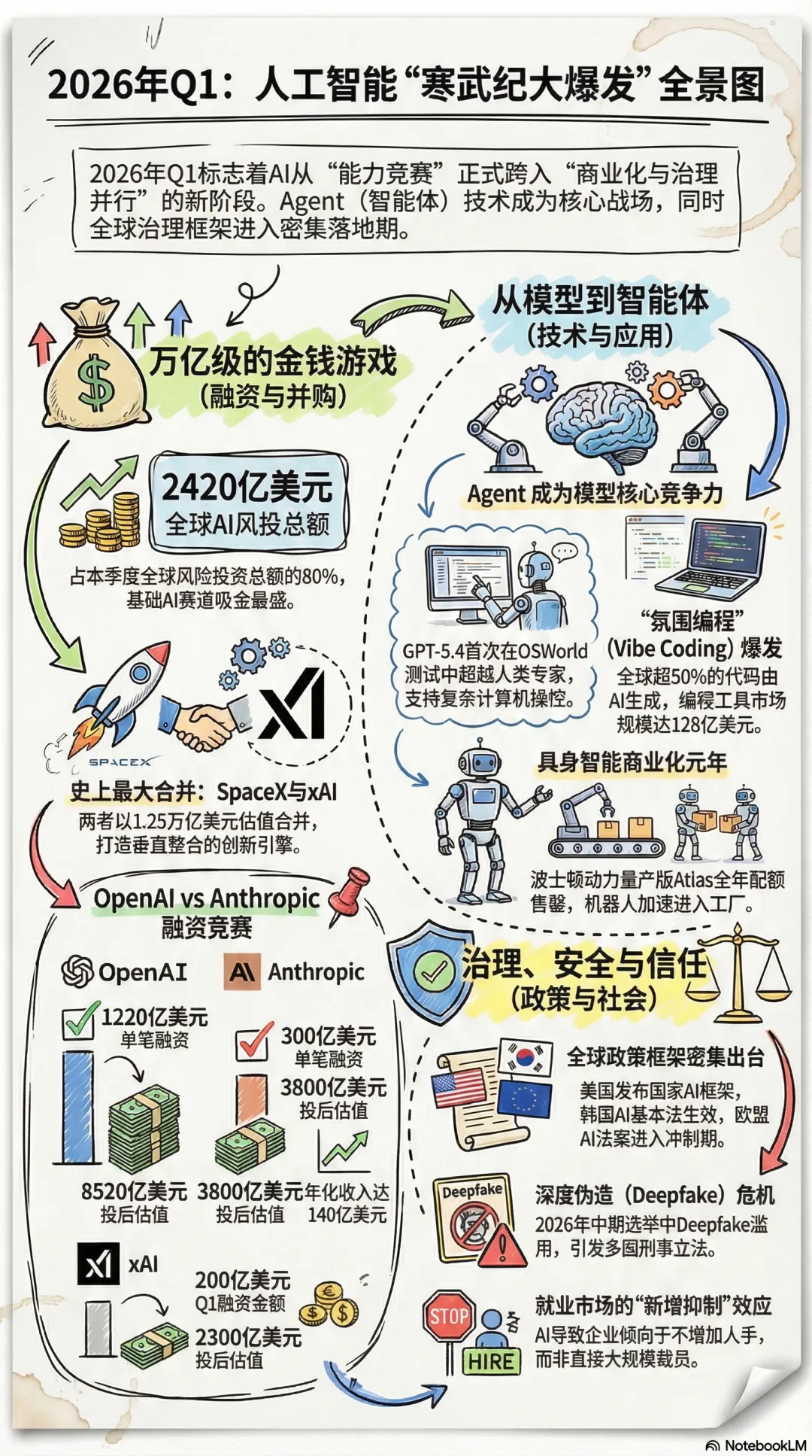 2026年第一季度人工智能行业全景报告2026年第一季度是人工智能历史上最具爆发力的一个季度。全球AI领域风险投资达2420亿美元,创下历史新高;OpenAI完成了人类商业史上最大单笔私募融资(1220亿美元);SpaceX与xAI完成了史上最大企业合并(合并估值1.25万亿美元)。与此同时,GPT-5.4、Claude Opus 4.6、Gemini 3.1 Pro等前沿模型密集发布,AI Agent(智能体)从概念走向大规模商用部署。在政策层面,美国特朗普政府发布国家AI政策框架,韩国AI基本法正式生效,印度举办了首个全球南方AI峰会并获92个国家签署《德里宣言》,而欧盟AI法案正加速推进至2026年8月全面实施。本季度标志着AI产业从"能力竞赛"正式进入"商业化与治理并行"的新阶段。