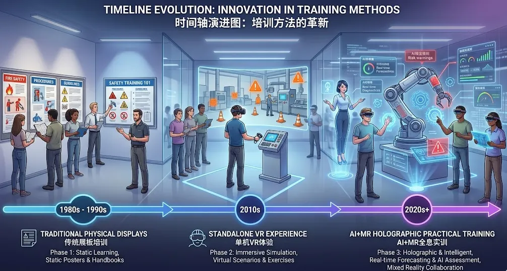 落地场景: 体验者可以看到真实的厂区环境和真实的同事,但系统会在真实设备上叠加“虚拟的火焰”或“泄漏的毒气”。这种“在真实工作环境中解决虚拟危机”的模式,将把实操演练的真实度推向巅峰。