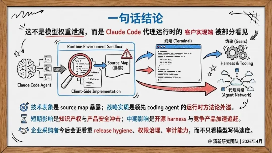 Claude Code事件是一次因发布治理失误引发的“被动开源”现象,而非黑客攻击导致的模型权重泄露。事件的核心在于客户端实现层的源码暴露,暴露的是工具编排、权限边界、记忆策略与交互流程等运行时方法论,而非模型本身。该事件揭示了AI coding agent在产品设计与供应链管理上的重要性,并对行业竞争格局、企业采购策略及安全治理框架产生了深远影响。
