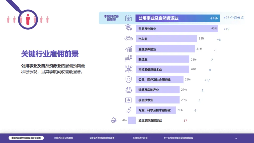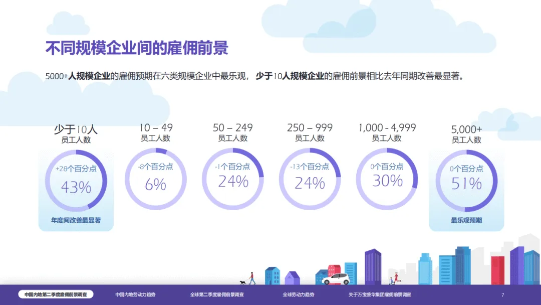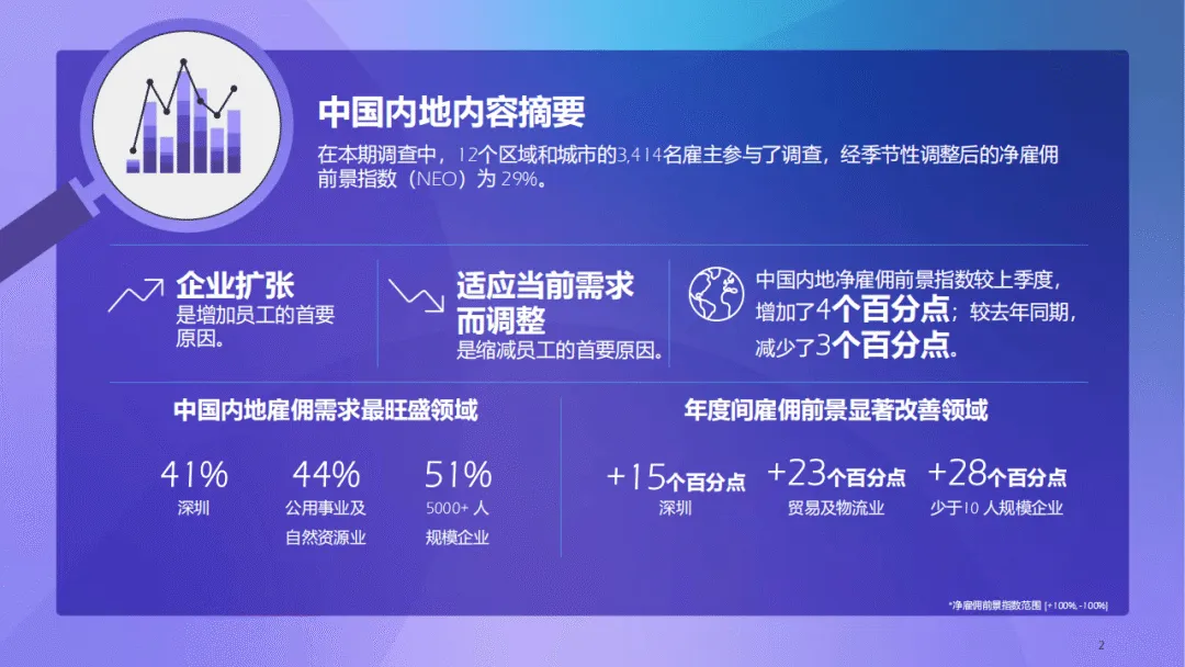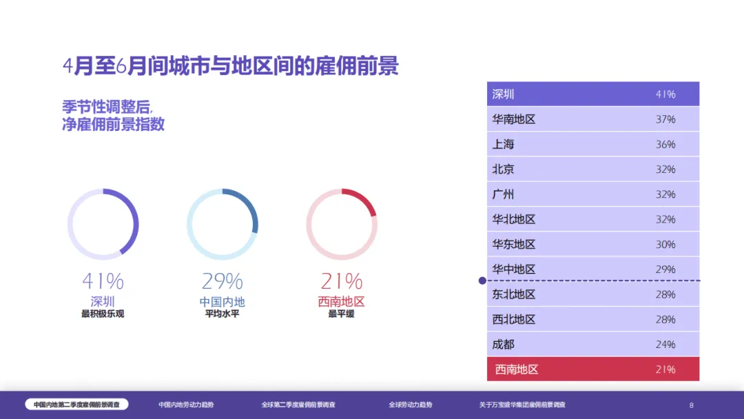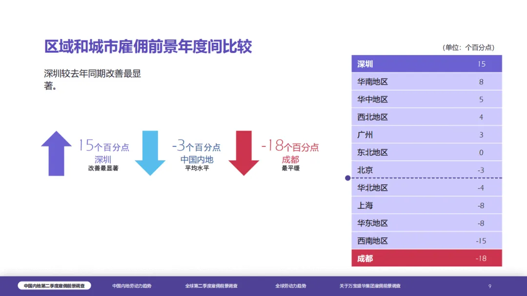 中国内地雇佣市场中,36%雇主计划增员,7%计划减员,56%计划维持员工规模。行业层面,公用事业及自然资源业雇佣预期最乐观且季度间改善最显著,贸易及物流业、汽车业也有明显提升;企业规模维度,5000人以上大型企业雇佣预期最积极,少于10人的小微企业年度间改善幅度最大。区域上,深圳NEO达41%居首,华南、上海、北京等区域紧随其后,西南地区则最为平缓,且深圳是年度间雇佣前景改善最显著的城市。