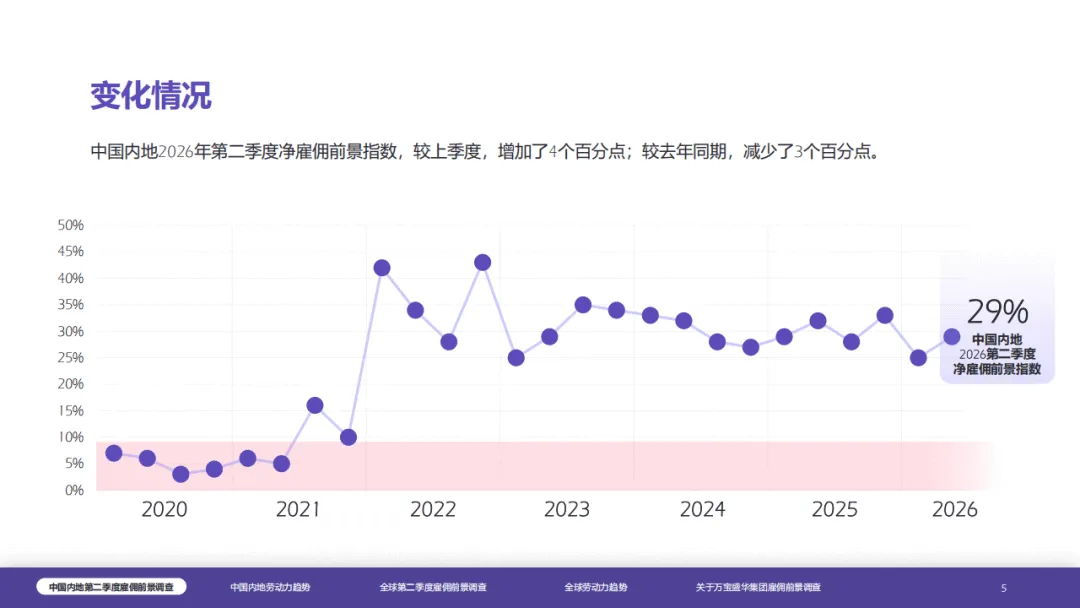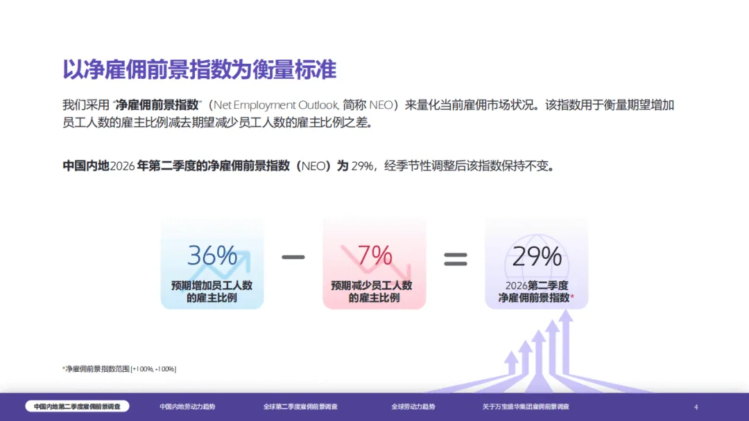 万宝盛华2026年Q2雇佣前景调查报告覆盖中国内地及全球市场,中国内地有12个区域3414名雇主参与,经季节性调整后净雇佣前景指数(NEO)为29%,较上季度提升4个百分点,较去年同期下降3个百分点;全球则有42个国家和地区超41700名雇主参与,NEO为31%,较上季度、去年同期分别提升6、7个百分点,企业扩张均为各地雇主增员的首要原因。