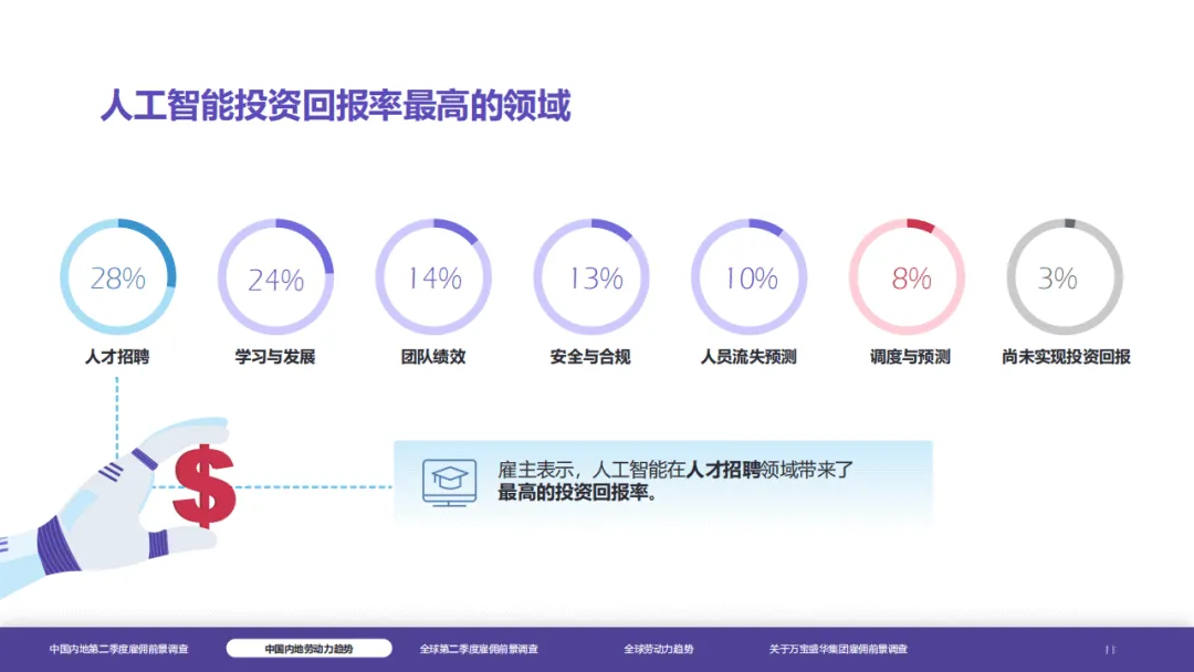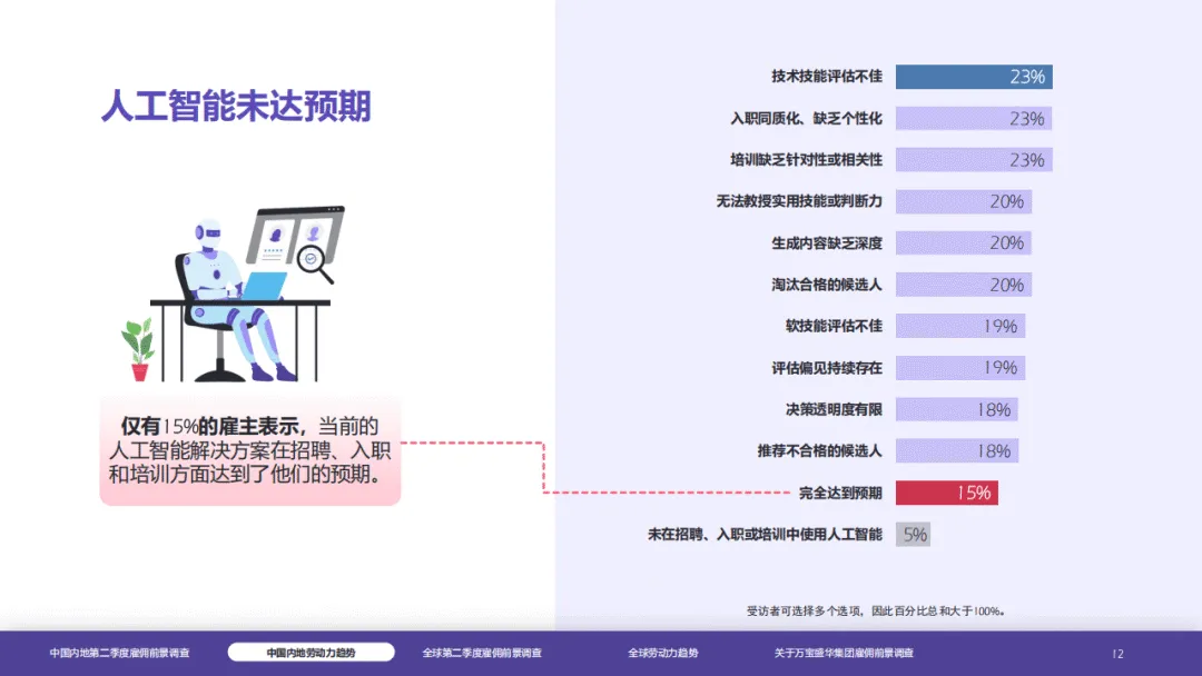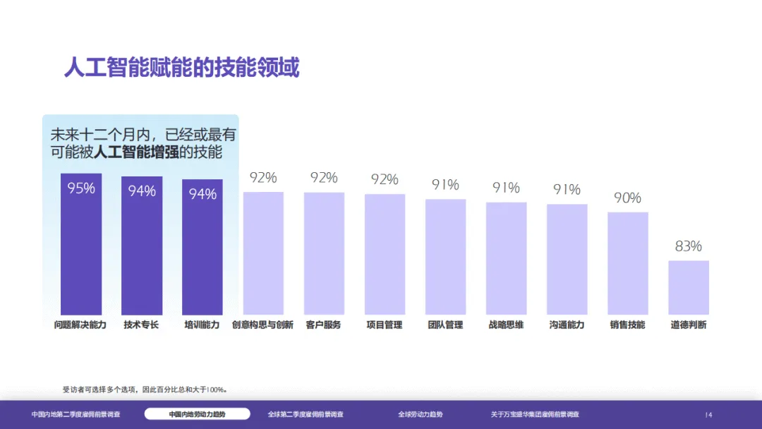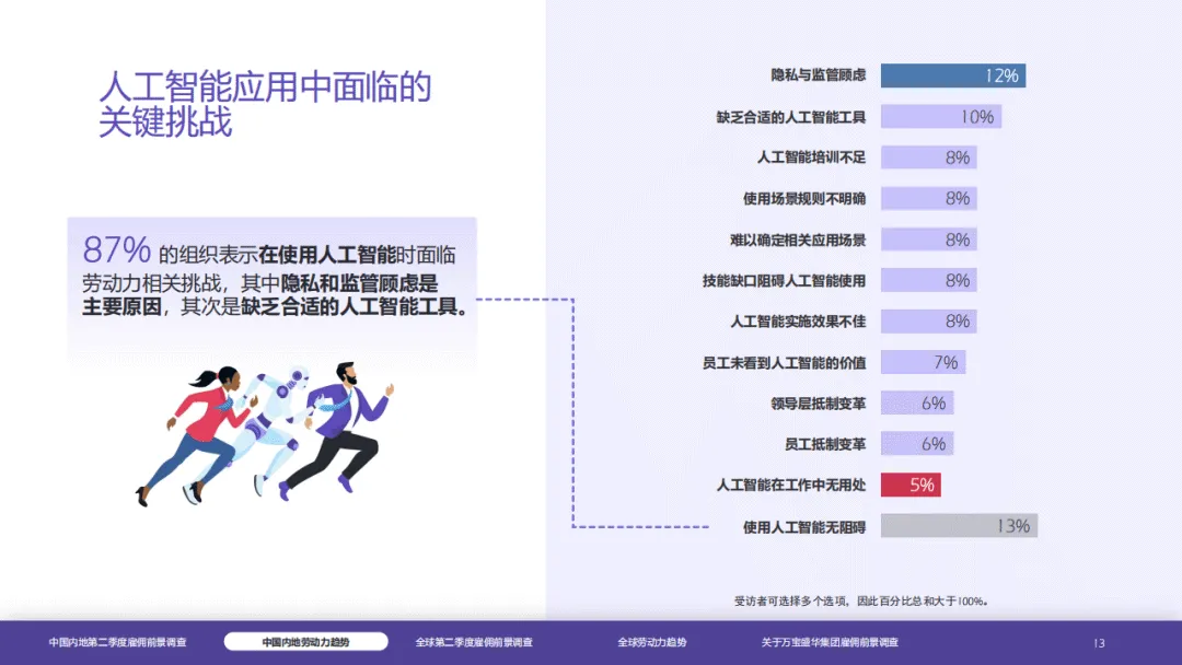 人工智能应用成为本次调查的重要关注点,中国内地雇主认为AI在人才招聘领域投资回报率最高,但仅15%的雇主表示AI解决方案达到预期,87%的组织面临AI应用的劳动力相关挑战,隐私与监管顾虑、缺乏合适工具是主要问题。全球范围内,AI在学习与发展领域回报率最高,仅8%雇主认可其应用效果,92%的组织遇应用挑战,隐私监管、培训和技能缺口为核心痛点,且创意构思、问题解决等技能被认为是最易被AI赋能的领域。