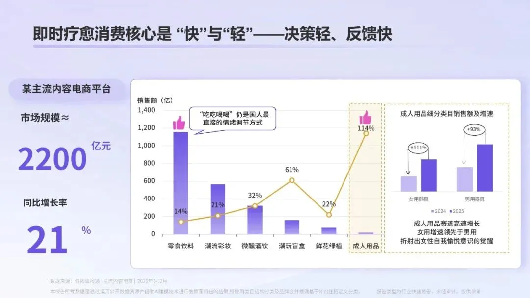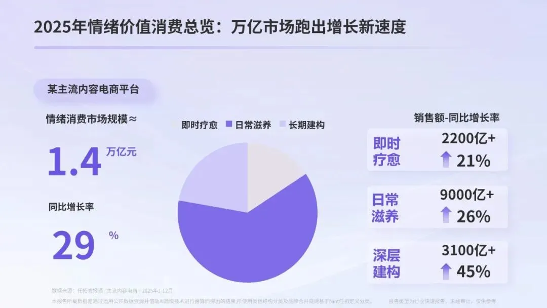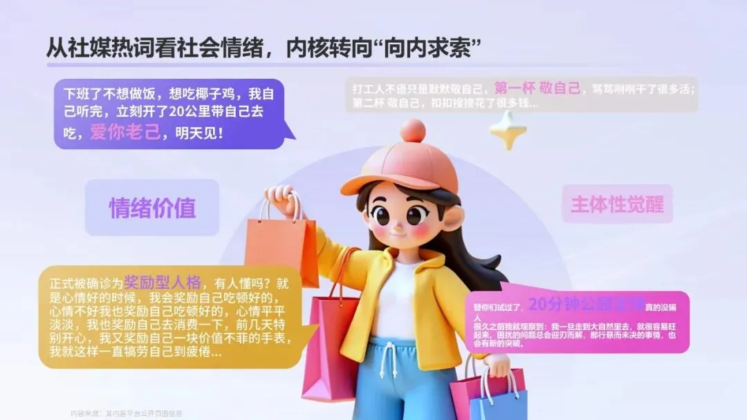 数据显示,2025 年,主流内容电商平台上,情绪消费的市场规模已经达到 1.4 万亿元,同比增长率达到 29%。这个万亿级的市场,正在跑出远超传统消费品类的增长速度。人们的消费逻辑,正在发生根本性的转向。从社交平台的热词更迭就能看出来,整个社会情绪的内核,已经转向向内求索。主体性觉醒,成了贯穿所有消费行为的主线。大家花钱,不再是为了满足别人的期待,而是为了取悦自己,安抚自己,建构自己。
