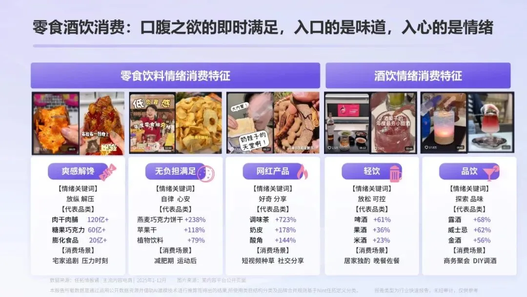 吃吃喝喝,永远是国人最直接的情绪调节方式。在即时疗愈类消费里,零食饮料和微醺酒饮,牢牢占据着市场的核心位置。人们在口腹之欲里,找到最直接的情绪出口。放纵解压的时刻,肉干肉脯的市场规模已经突破 120 亿元,糖果巧克力超过 60 亿元,膨化食品也有 20 亿以上的体量。想要无负担的满足,燕麦巧克力饼干同比增长 238%,苹果干和各类植物饮料,成了减肥期和运动后的首选。好奇分享的社交场景里,调味茶同比增长 723%,奶皮增长 178%,酸角增长 144%,这些带着地域特色的网红产品,靠着短视频种草快速出圈,成了年轻人社交货币里的硬通货。