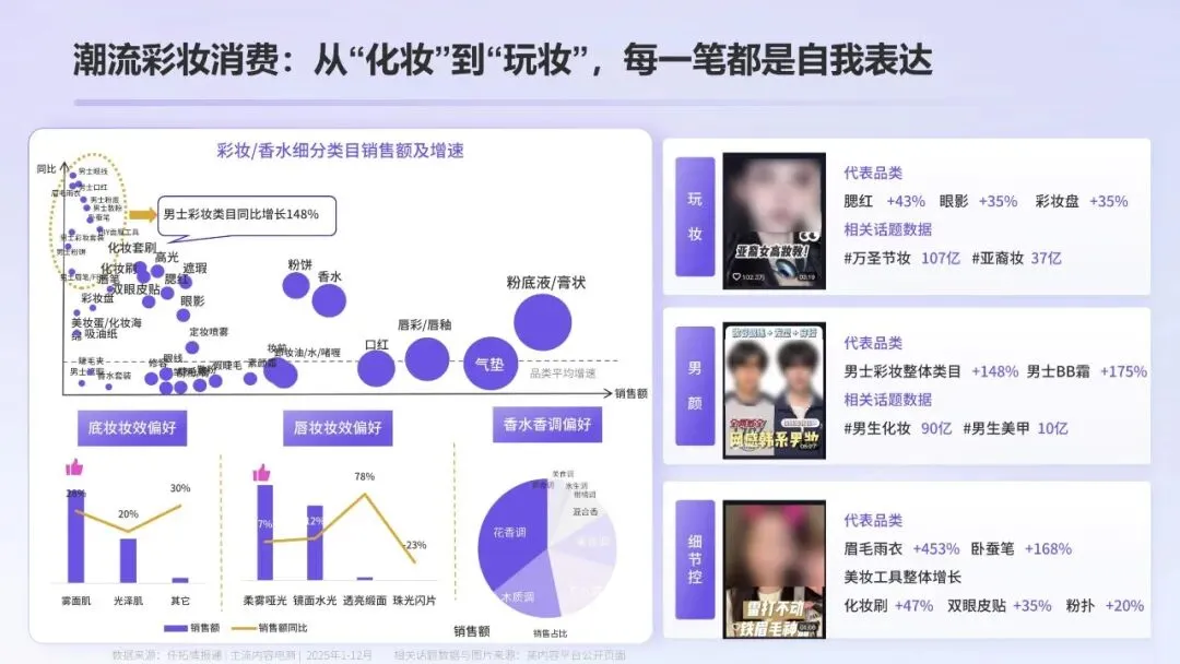 潮流彩妆的消费逻辑,也早已从化妆变成了玩妆。每一笔落在脸上的色彩,都是年轻人的自我表达。腮红同比增长 43%,眼影和彩妆盘都有 35% 的增长,万圣节妆、亚裔妆相关话题,在社交平台分别创下 107 亿和 37 亿的浏览量。男生也不再被彩妆拒之门外,男士彩妆整体类目同比增长 148%,男士 BB 霜增长 175%,男生化妆相关话题浏览量达到 90 亿。