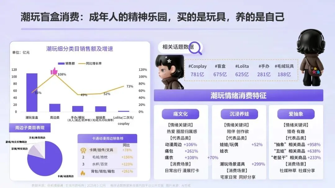 潮玩盲盒,成了成年人的精神乐园。大家买的是玩具,养的是自己。动漫周边同比增长 106%,痛包增长 261%,痛衣增长 108%,带着鲜明圈层属性的产品,给了年轻人强烈的归属感。娃娃和玩偶同比增长 52%,娃衣增长 108%,沉浸养娃的过程里,人们释放着自己的陪伴欲和创作欲。更让人意外的是,带着猎奇属性的产品增速惊人,抽象相关商品同比增长 958%,丑娃相关商品增长 638%,哪怕是看起来奇奇怪怪的东西,只要能戳中情绪,就有无数人愿意买单。
