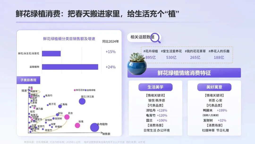 鲜花绿植的消费,是把春天搬进家里,给生活充个植。盆栽植物同比增长 24%,鲜花永生花类也有 15% 的增长。洋牡丹同比增长 128%,龟背竹增长 120%,国兰增长 106%,一盆绿植一束鲜花,就能给日常的生活和办公环境,添上满满的愉悦感和秩序感。带着美好寓意的品类更受欢迎,别称八方来财的鸭脚木同比增长 199%,发财树增长 32%,人们在绿植里,找的不只是生活美学,还有祈愿的心安。