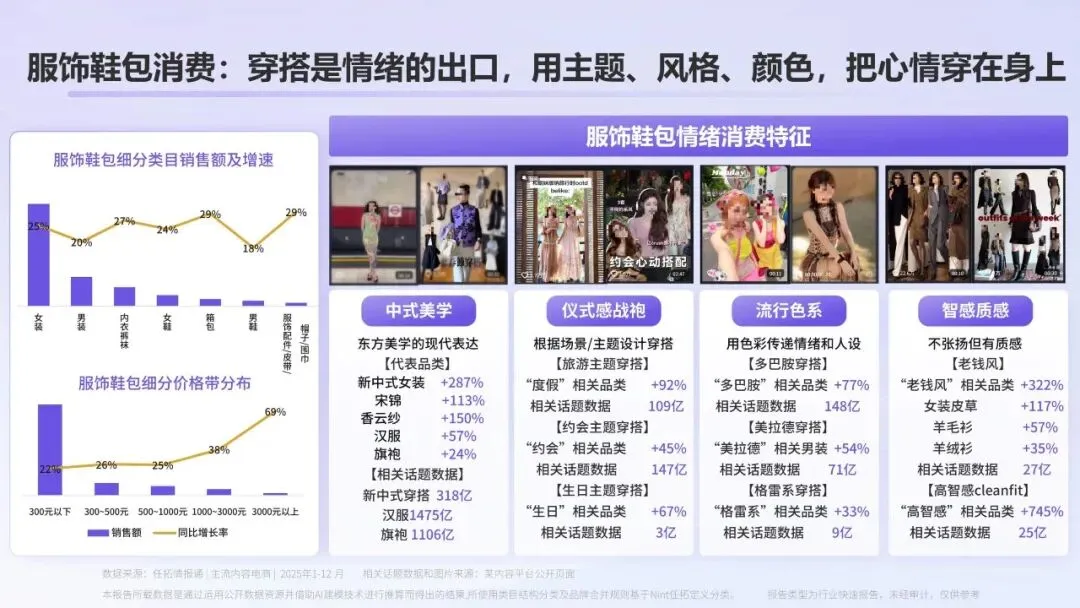 穿搭从来都是情绪的出口。人们用主题、风格、颜色,把心情穿在身上。新中式女装同比增长 287%,宋锦增长 113%,刻在中国人 DNA 里的东方美学,正在以全新的方式回归。高智感相关品类同比增长 745%,老钱风相关品类增长 322%,不张扬的质感,成了很多人表达自我的新方式。场景化穿搭的增速同样惊人,约会相关品类增长 150%,度假相关增长 92%,生日相关增长 67%,每一个值得纪念的时刻,都有一套专属的穿搭来承载情绪。流行色系也成了情绪的载体,多巴胺相关品类增长 77%,美拉德相关男装增长 54%,格雷系相关品类增长 33%,穿什么颜色,就是当下有什么样的心情。穿搭不再只是为了蔽体保暖,而是为了表达自我,安放情绪。