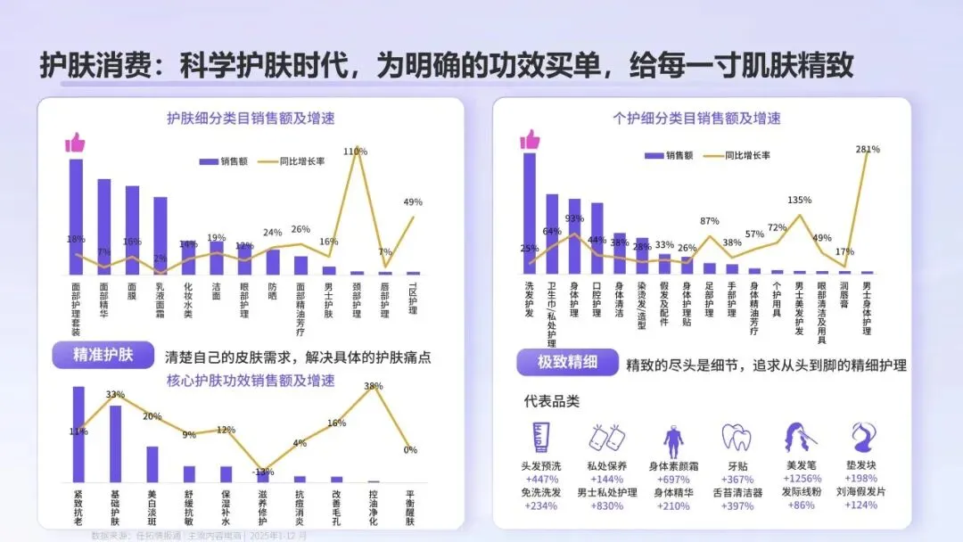 科学护肤和品质个护的消费,正在走向极致的精细化。大家清楚知道自己的皮肤需求,为明确的功效买单,给每一寸肌肤最妥帖的关照。身体素颜霜同比增长 447%,私处保养增长 697%,牙贴增长 1256%,男士私处护理增长 830%,从面部到身体,从头发丝到脚趾尖,精致的边界正在不断拓宽。个护赛道里,假发及配件同比增长 281%,卫生巾和私处护理增长 135%,染烫发造型增长 87%,人们在从头到脚的精细护理里,找到的是对自己身体的掌控感,是那份不慌不忙的安心。