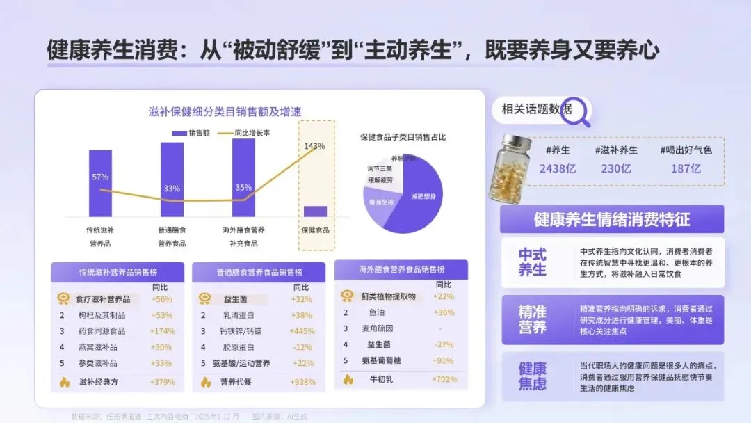 健康养生的消费,已经从被动舒缓转向主动养生。当代人的养生,既要养身,也要养心。药食同源食品同比增长 174%,枸杞及其制品增长 53%,人们把中式滋补融进日常饮食,在传统智慧里找温和的养生方式。精准营养的需求同样旺盛,营养代餐同比增长 938%,牛初乳增长 702%,益生菌增长 36%,大家研究成分,针对性解决健康问题,缓解快节奏生活里的健康焦虑。传统滋补品类里,燕窝滋补品同比增长 445%,滋补经典方增长 379%,参类滋补品增长 33%,中式养生背后,是年轻人的文化认同,也是对自己身体的负责。
