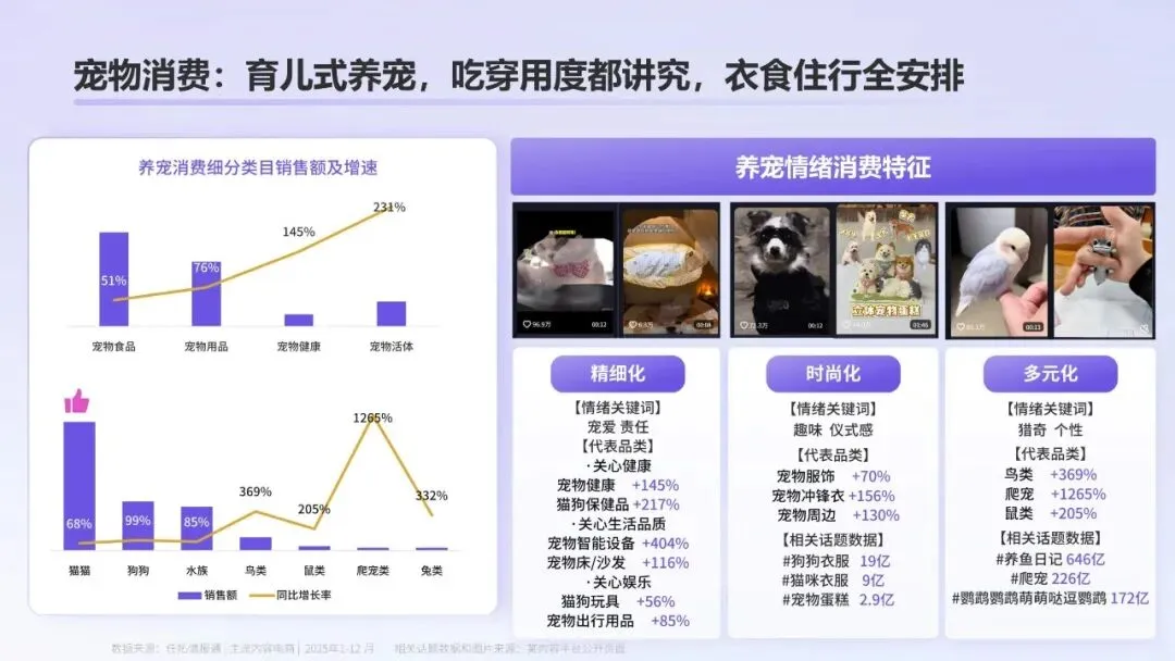 宠物消费的核心,是双向的情绪治愈。育儿式养宠,成了当下养宠人的常态,毛孩子的吃穿用度,都被安排得明明白白。宠物健康类目同比增长 145%,猫狗保健品增长 217%,宠物智能设备增长 404%,人们关心毛孩子的健康,给它们最好的生活品质。宠物服饰同比增长 70%,宠物冲锋衣增长 156%,宠物周边增长 130%,哪怕是一件小衣服,一个小蛋糕,都藏着满满的仪式感。异宠品类的增速更是惊人,爬宠类同比增长 1265%,鸟类增长 369%,鼠类增长 205%,从猫猫狗狗到水族爬宠,宠物的边界在不断拓宽,不变的,是人们对陪伴的需求,是双向奔赴的情绪价值。