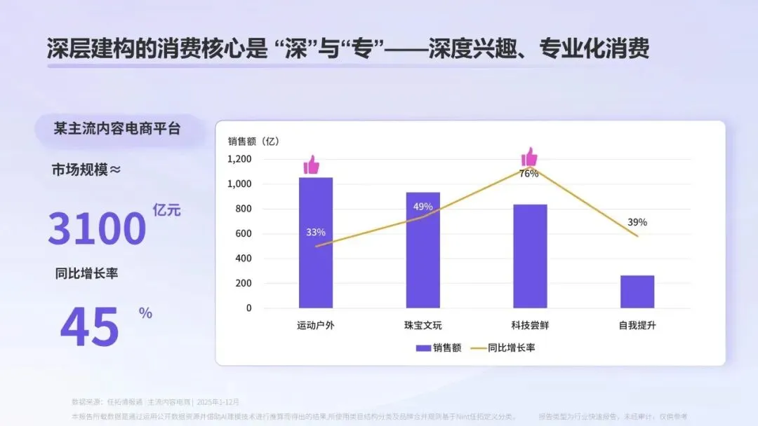 当日常的情绪滋养已经成为常态,越来越多人开始通过消费,完成更深层次的自我建构。深度建构类消费,靠着 45% 的同比增速,成为情绪消费市场里最亮眼的存在。这个赛道的核心,是深与专,是深度的兴趣投入,是专业化的消费选择,人们在这里,实现身份认同,找到圈层归属。