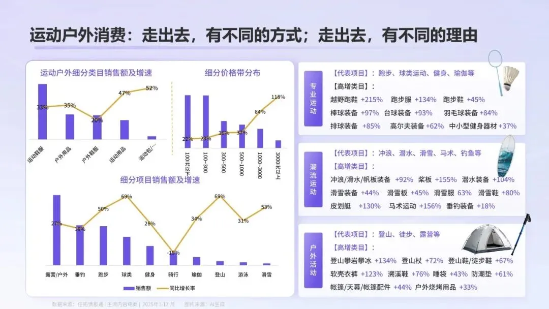 潮流运动里,桨板同比增长 155%,马术运动增长 156%,冲浪滑水装备增长 92%,潜水装备增长 104%,滑雪服增长 63%,越来越多人走进山野,走进海洋,在挑战自我的过程里,释放情绪,找到自我。户外活动里,登山攀岩攀冰类目同比增长 134%,软壳衣裤增长 123%,帐篷天幕增长 44%,人们在露营徒步里,逃离城市的喧嚣,和自然相处,也和自己对话。运动户外不再只是为了强身健体,更是为了情绪的释放,为了同好圈层的归属,为了找到更鲜活的自己。