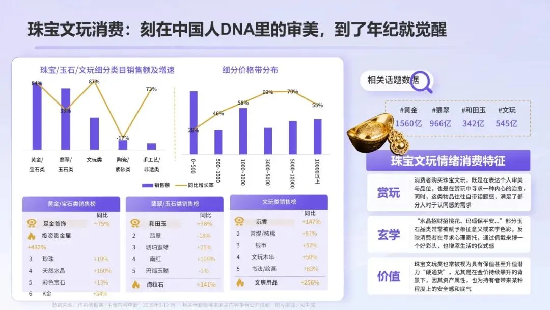 珠宝文玩的消费,是刻在中国人 DNA 里的审美觉醒。人们买珠宝文玩,既是表达个人审美与品位,也是在赏玩中寻求内心的治愈。黄金品类依旧是绝对的主流,投资贵金属同比增长 432%,足金首饰牢牢占据销售榜首。在金价持续攀升的背景下,黄金自带的硬通货属性,给了持有者最实在的安全感和底气。玉石品类里,和田玉同比增长 78%,南红增长 109%,海纹石增长 141%,水晶玛瑙被赋予招财保平安的寓意,人们在佩戴的过程里,找到心理寄托,也给生活添上满满的仪式感。文玩品类里,菩提核桃同比增长 87%,文玩木串增长 50%,盘玩的过程,是慢下来的过程,是和自己相处的过程,指尖的摩挲里,焦躁的情绪被一点点抚平。