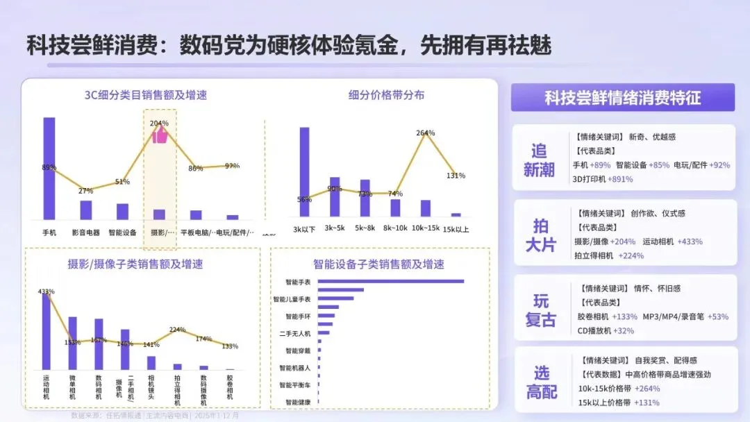 科技尝鲜的消费,是数码党为硬核体验的氪金。大家先拥有,再祛魅,在科技产品里,找新奇,找情怀,找自我奖赏的满足感。摄影摄像类目同比增长 204%,运动相机增长 433%,拍立得相机增长 224%,人们用镜头记录生活,释放创作欲,给日常的生活添上满满的仪式感。智能设备类目同比增长 85%,电玩配件增长 92%,3D 打印机增长 891%,最新的科技产品,给了人们走在时代前沿的优越感。复古风潮也在席卷数码圈,胶卷相机同比增长 133%,CD 播放机增长 32%,人们在老物件里,找回怀旧的情怀,安放逝去的时光。