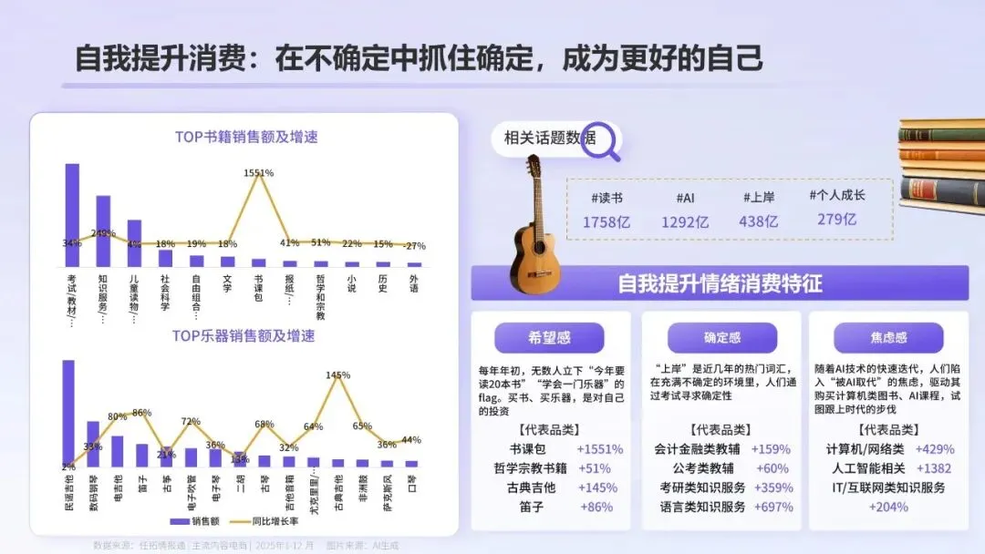 自我提升的消费,是人们在不确定的环境里,抓住确定的底气。买书,买课,买乐器,都是对自己的投资,都是为了成为更好的自己。人工智能相关书籍同比增长 1382%,计算机网络类书籍增长 429%,IT 互联网类知识服务增长 204%,AI 技术的快速迭代,让很多人陷入被取代的焦虑,而这些书籍和课程,就是大家对抗焦虑的武器。