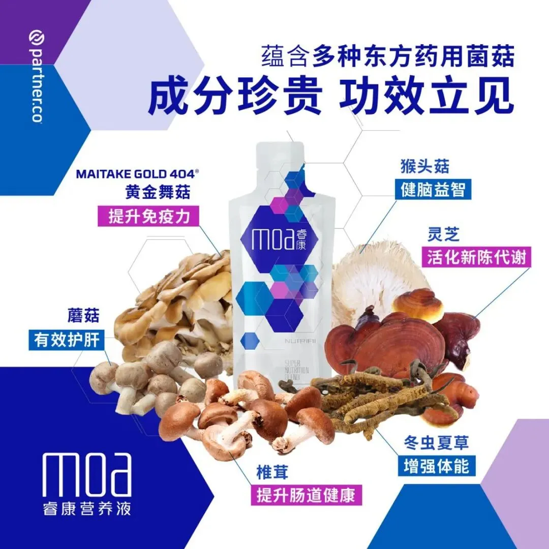 - 睿康营养液 (MOA):百雅康的“蘑菇黑科技”。蕴含6种药品级菌菇(包括灵芝、舞菇、冬虫夏草、云芝、椎茸、姬松茸),采用专利MycoFusion®技术提升多糖体吸收效能。其设计逻辑正是通过多种药用蘑菇的协同作用,双向调节免疫力,支持细胞健康,与趋势中提到的蘑菇提取物组合功效高度契合。